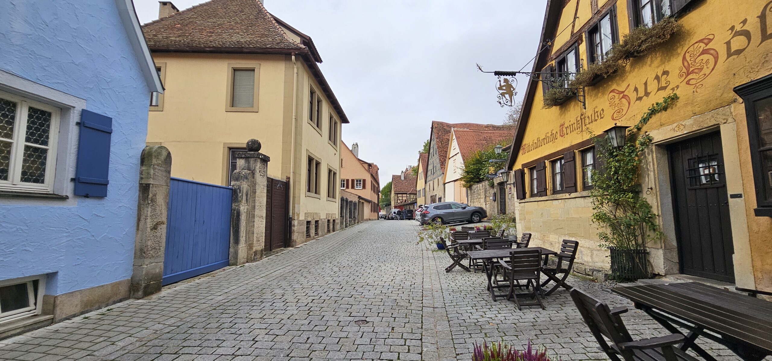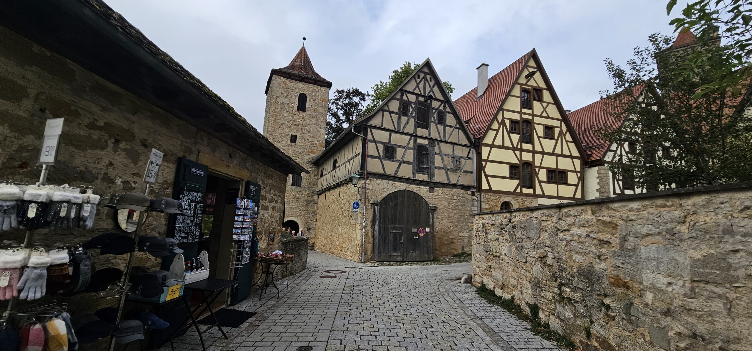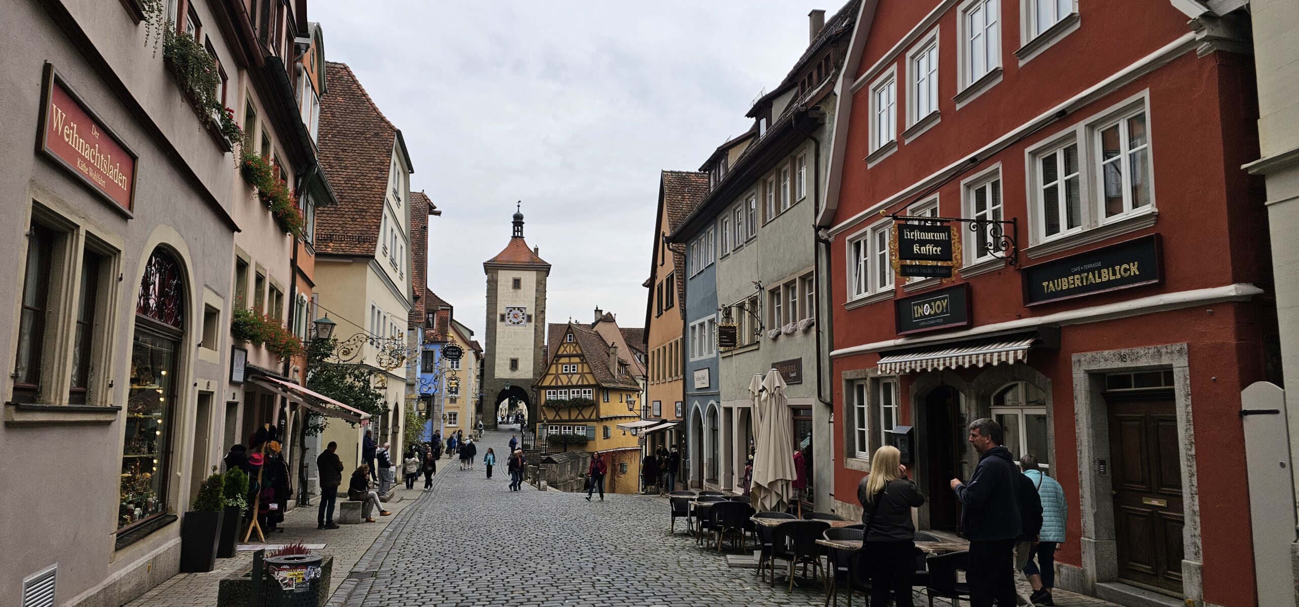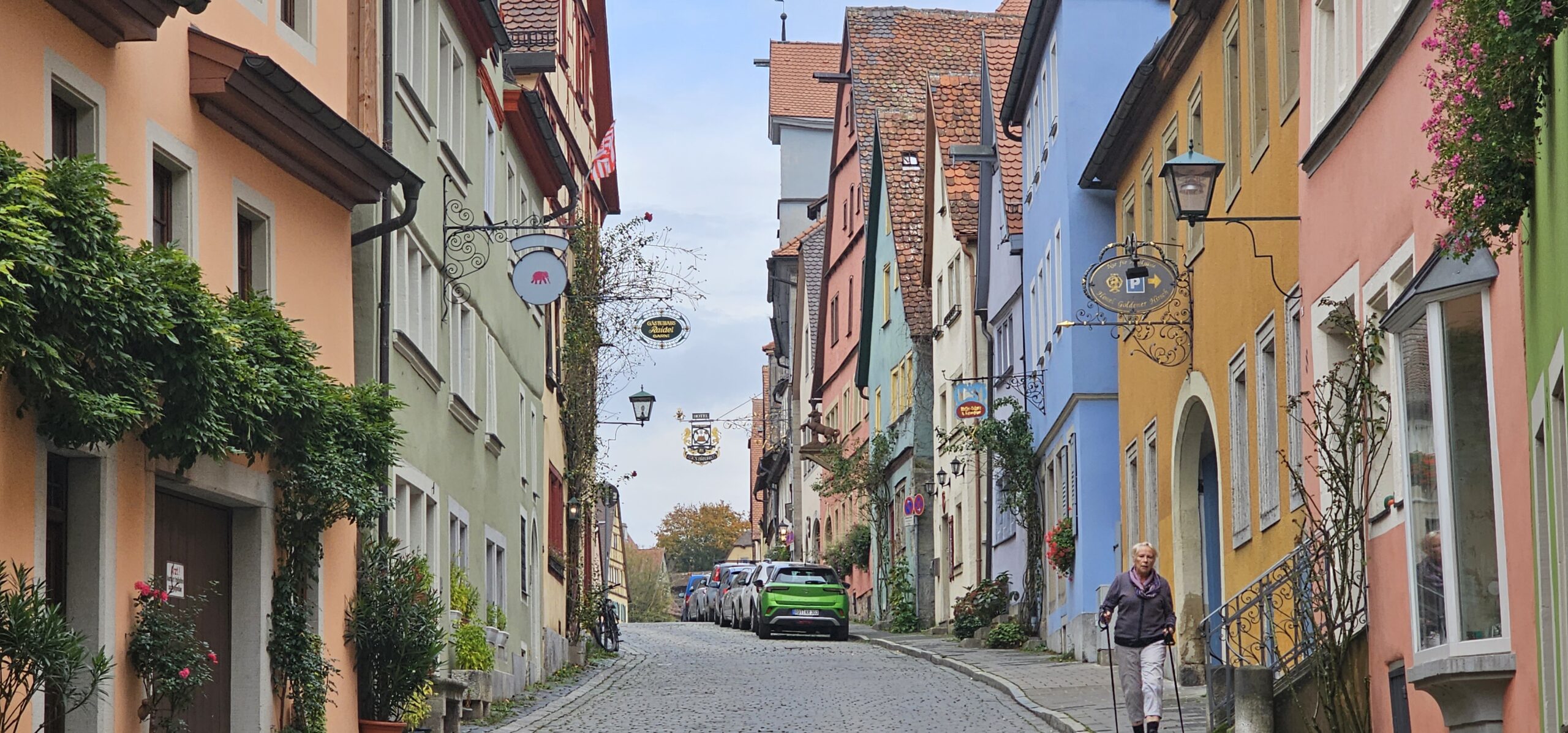 Rothenburg ob der Tauber means: Rothenburg on the Tauber (River). We arrive at Rothenburg and enter through one of the old main gates to reach the interior of the town. We had researched this and found it is rated a top-notch destination, and we find it doesn’t disappoint. This town is renowned for its well-preserved medieval architecture and the town’s layout and buildings have remained largely unchanged since the Middle Ages. This includes its intact city walls and towers where you can walk the parameter and enjoy panoramic views of the surrounding country. Rothenburg is one of only four towns in Germany that still have completely intact city walls.