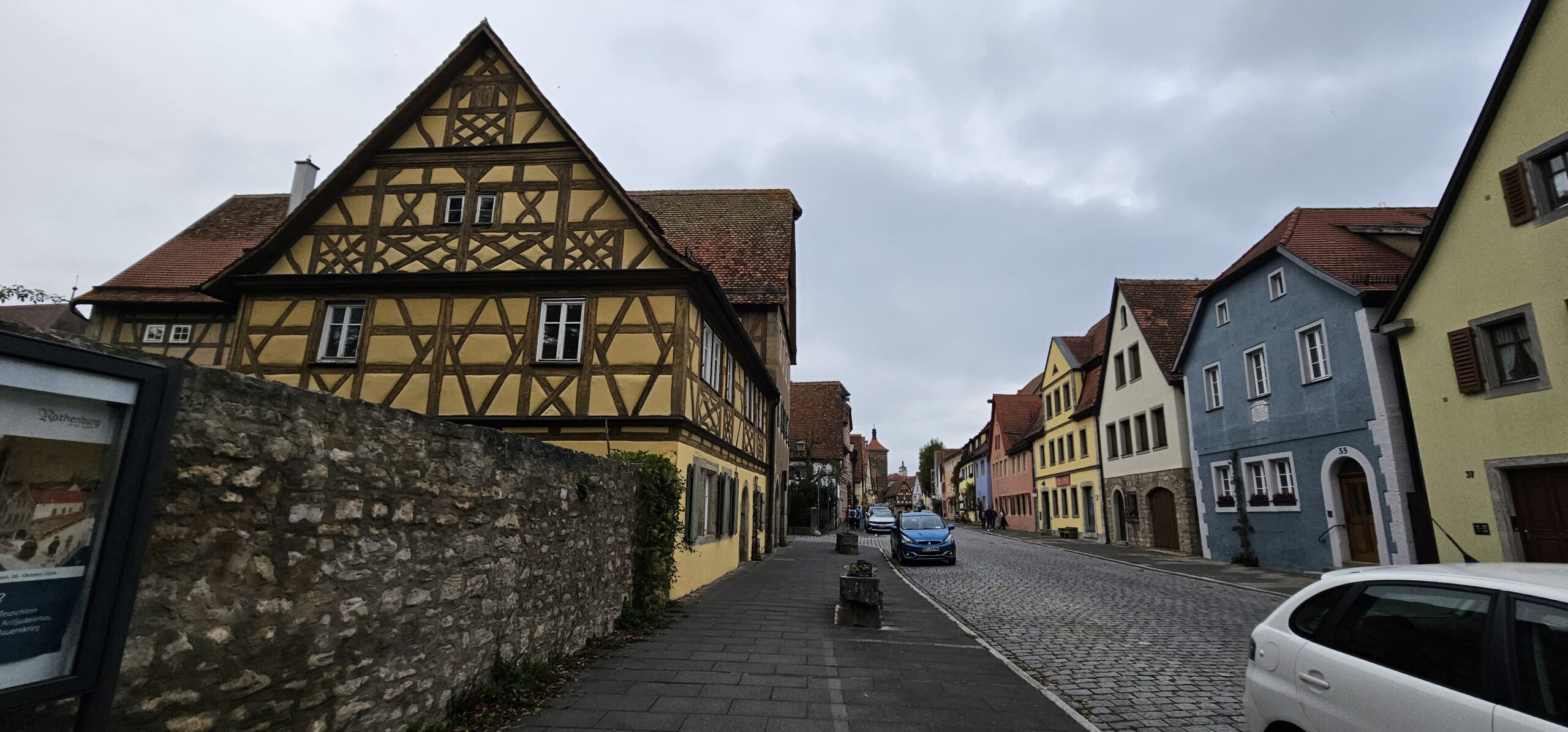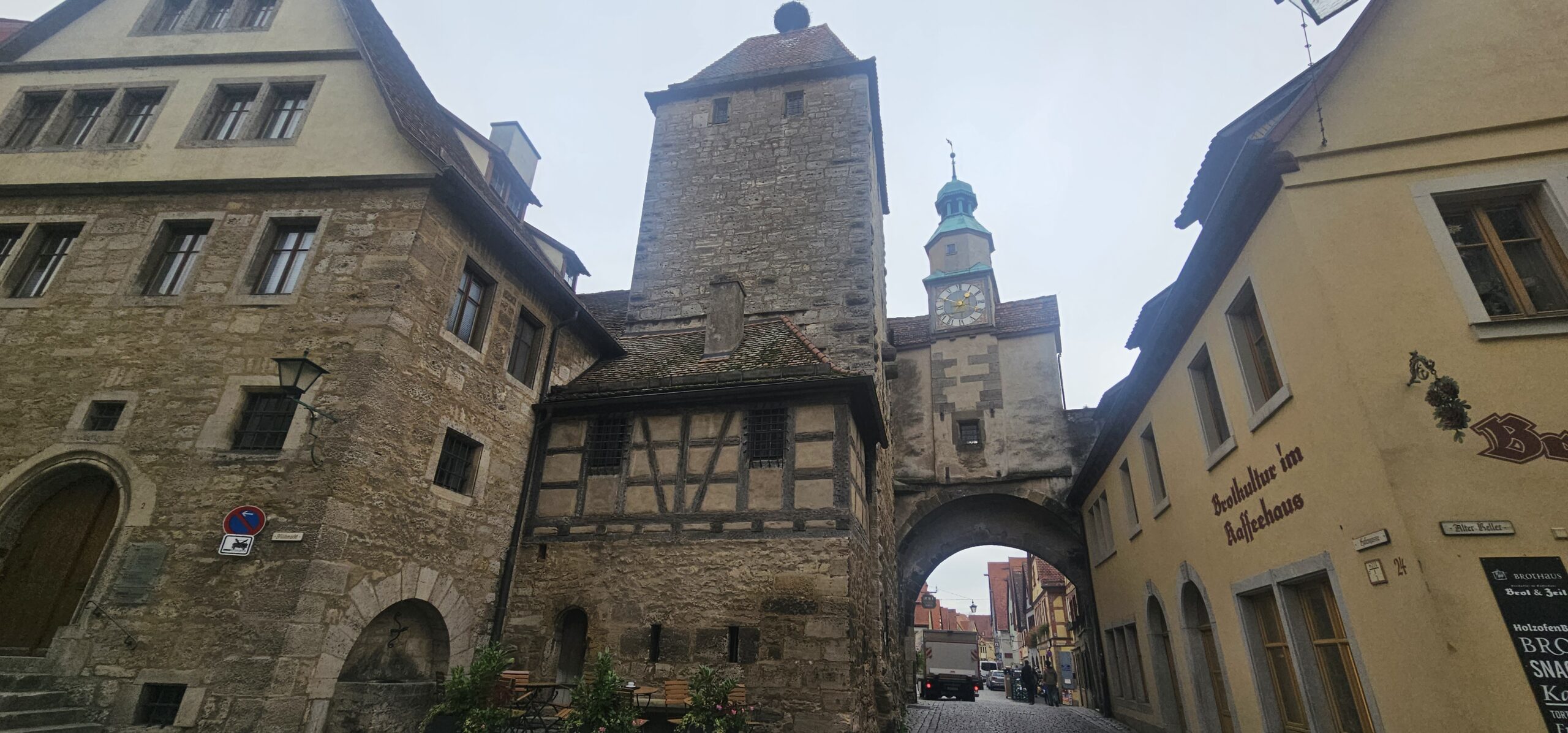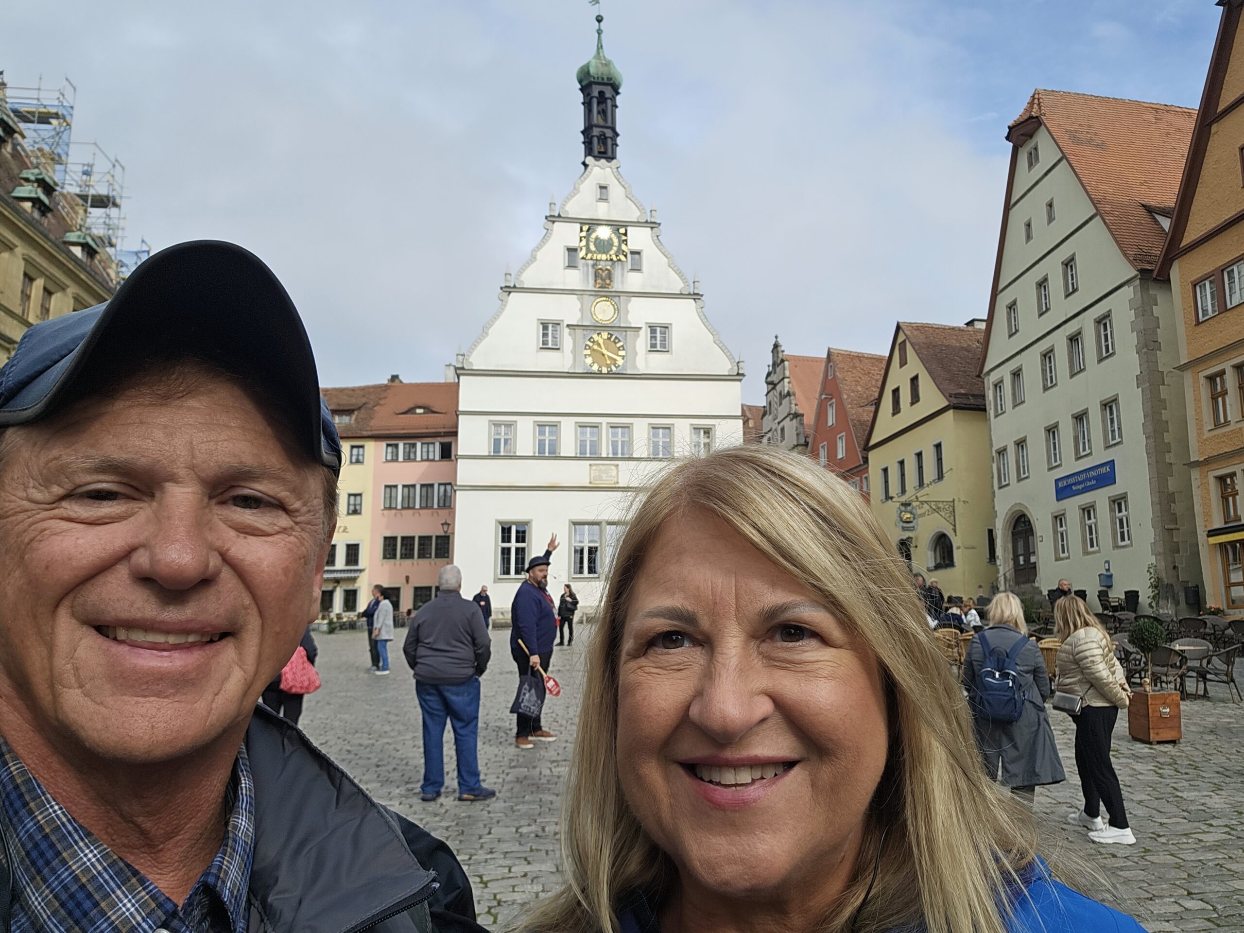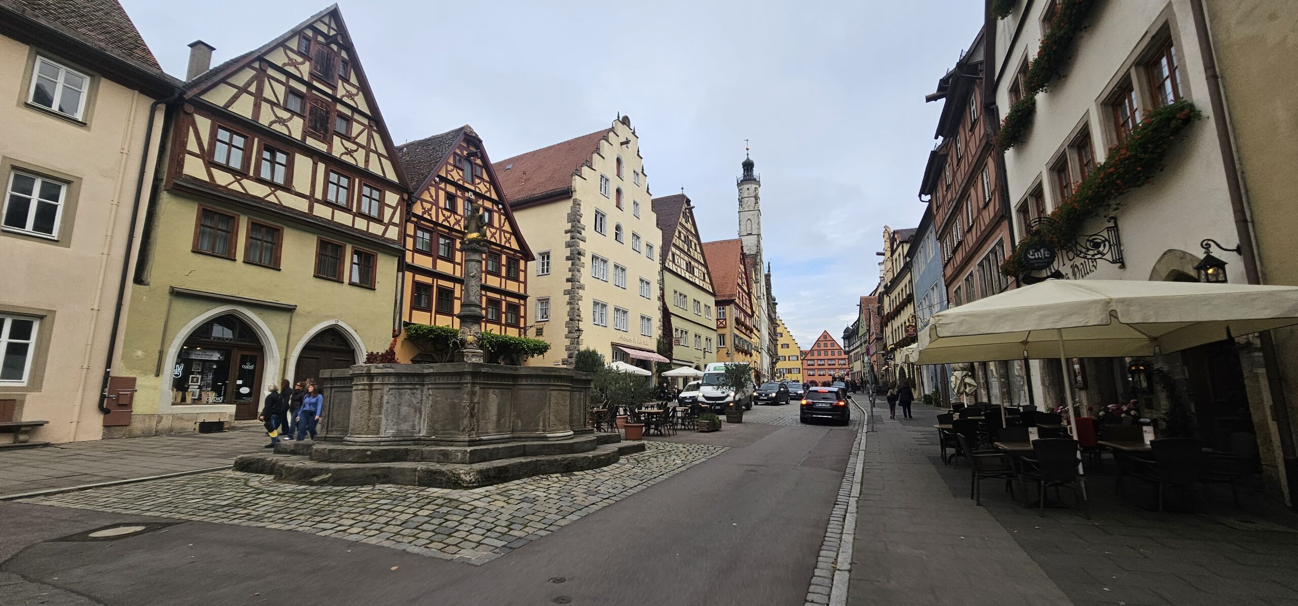 Rothenburg ob der Tauber means: Rothenburg on the Tauber (River). We arrive at Rothenburg and enter through one of the old main gates to reach the interior of the town. We had researched this and found it is rated a top-notch destination, and we find it doesn’t disappoint. This town is renowned for its well-preserved medieval architecture and the town’s layout and buildings have remained largely unchanged since the Middle Ages. This includes its intact city walls and towers where you can walk the parameter and enjoy panoramic views of the surrounding country. Rothenburg is one of only four towns in Germany that still have completely intact city walls.