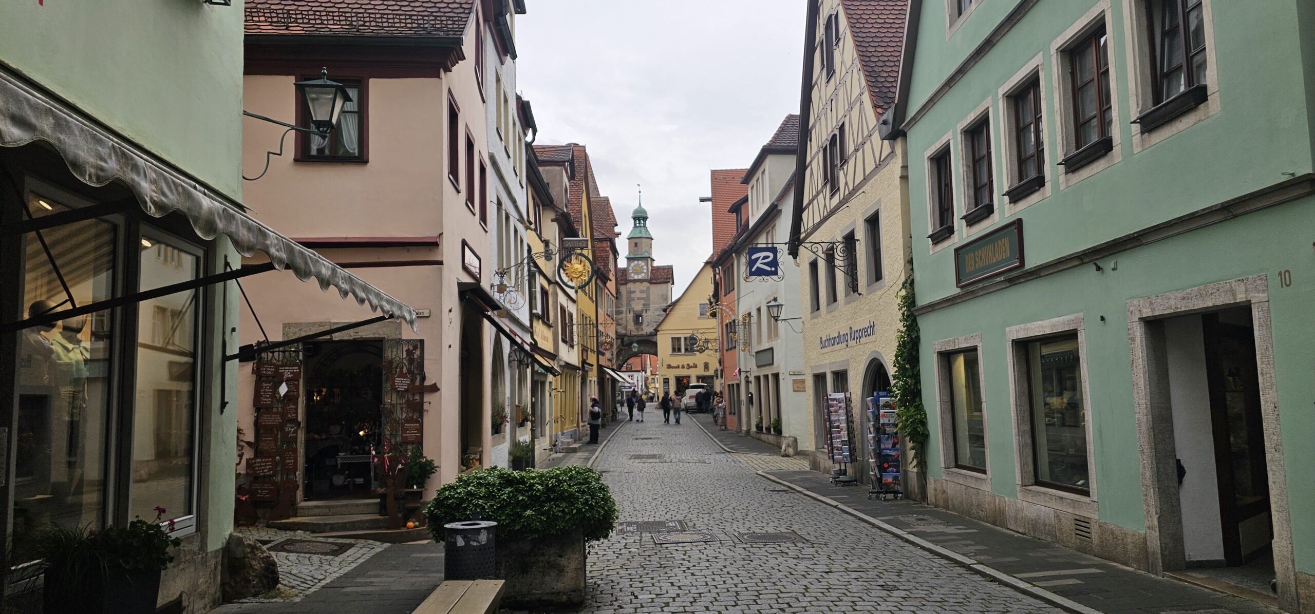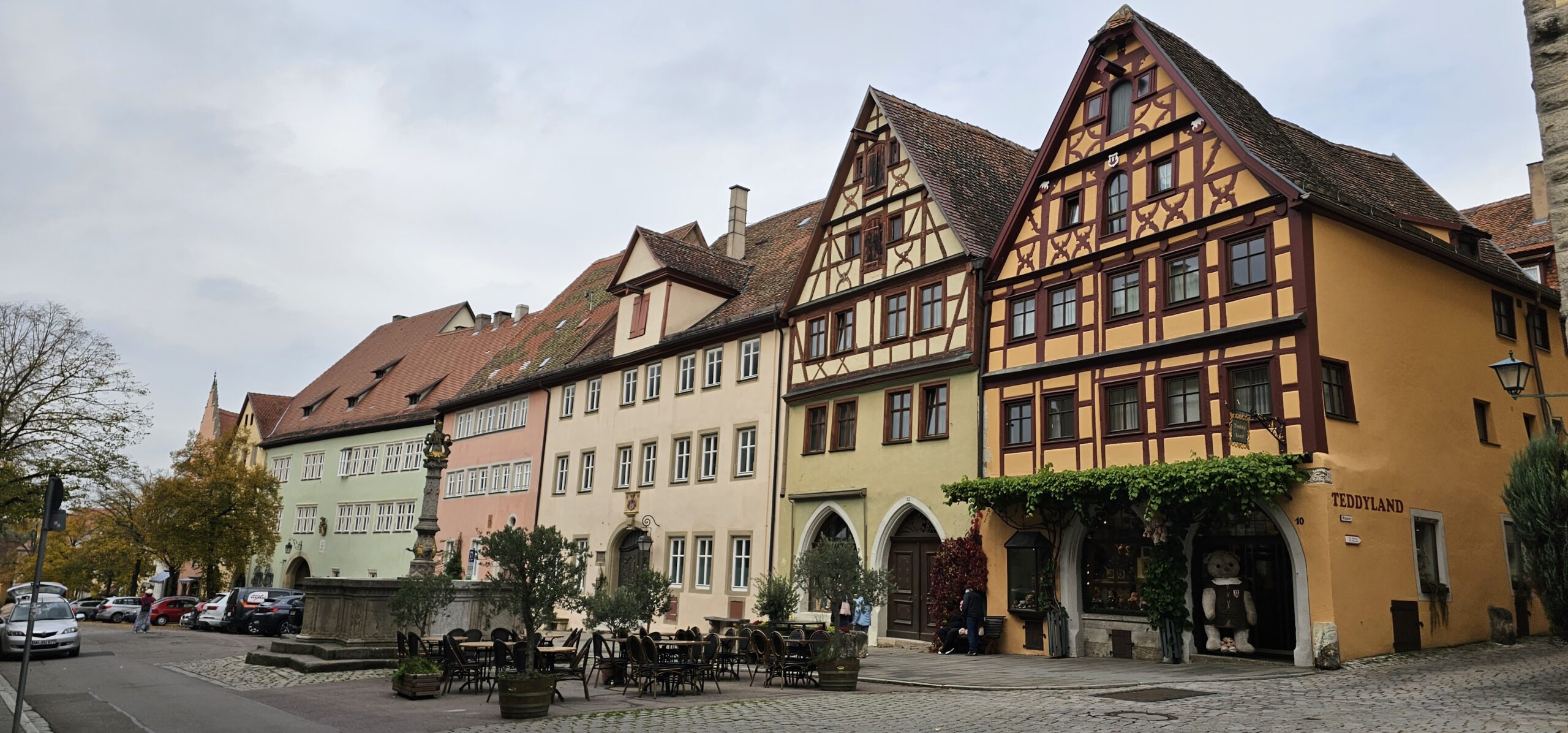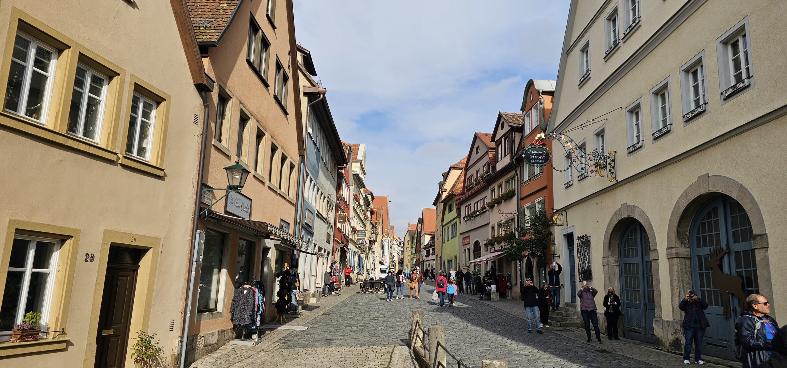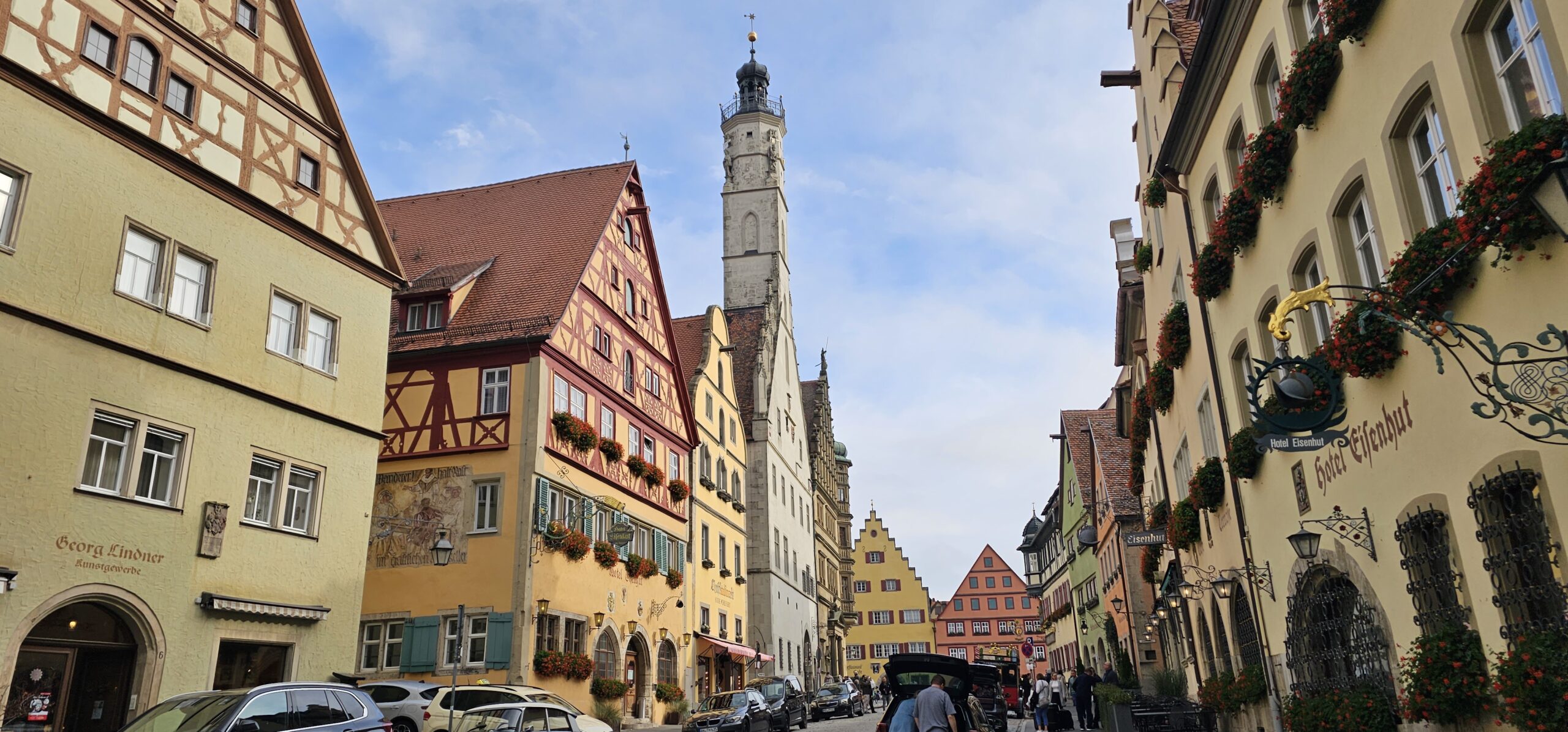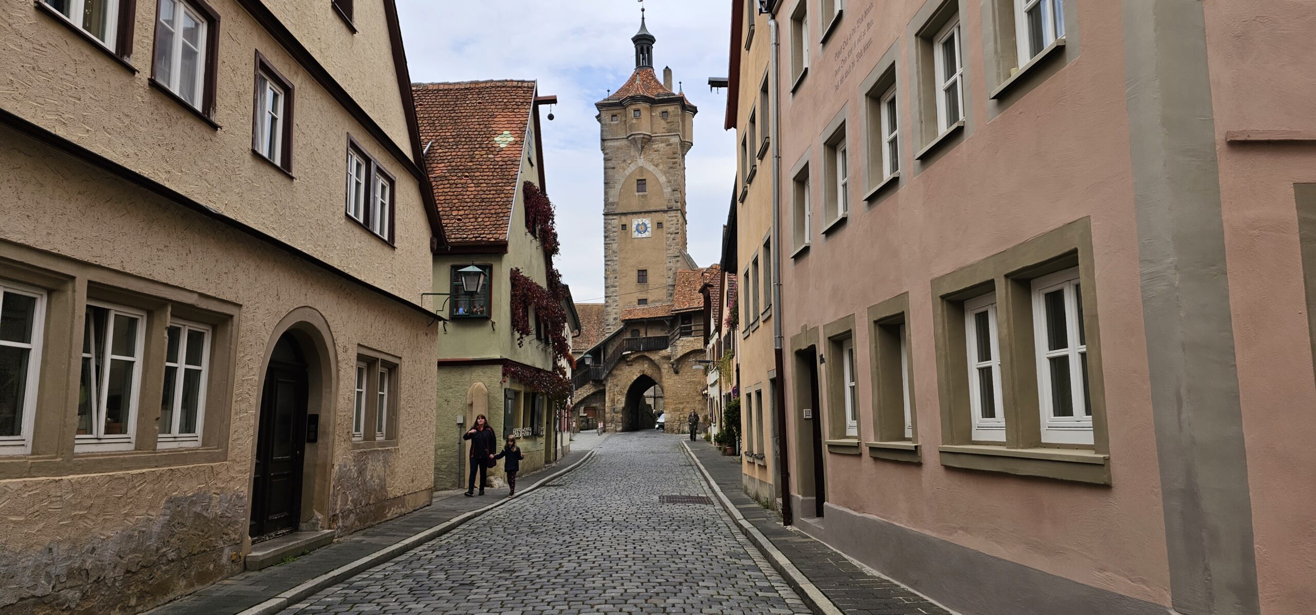 Rothenburg ob der Tauber means: Rothenburg on the Tauber (River). We arrive at Rothenburg and enter through one of the old main gates to reach the interior of the town. We had researched this and found it is rated a top-notch destination, and we find it doesn’t disappoint. This town is renowned for its well-preserved medieval architecture and the town’s layout and buildings have remained largely unchanged since the Middle Ages. This includes its intact city walls and towers where you can walk the parameter and enjoy panoramic views of the surrounding country. Rothenburg is one of only four towns in Germany that still have completely intact city walls.