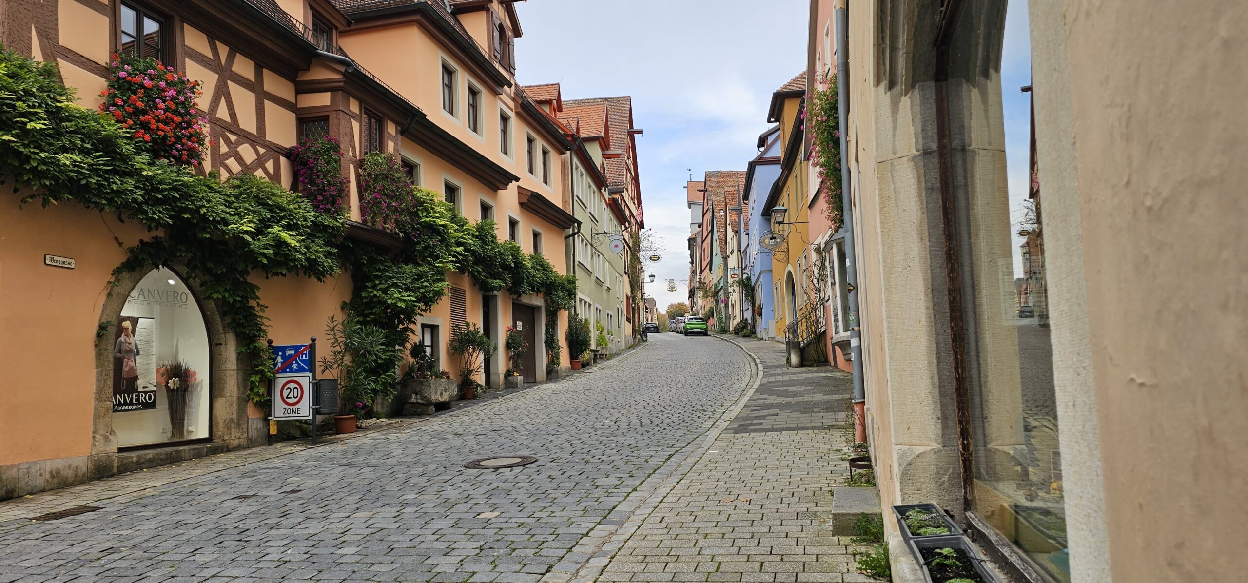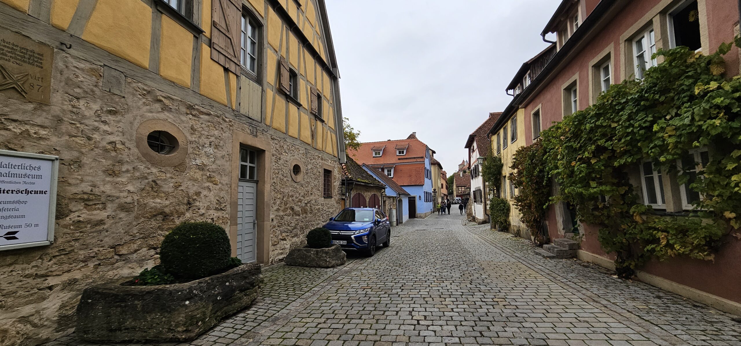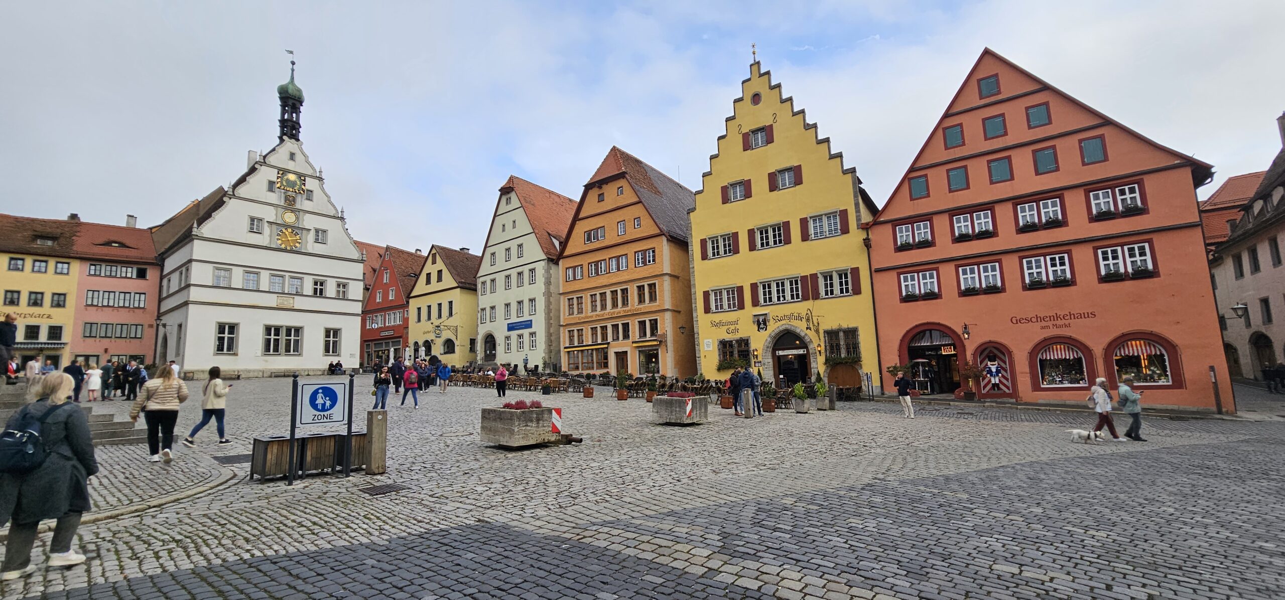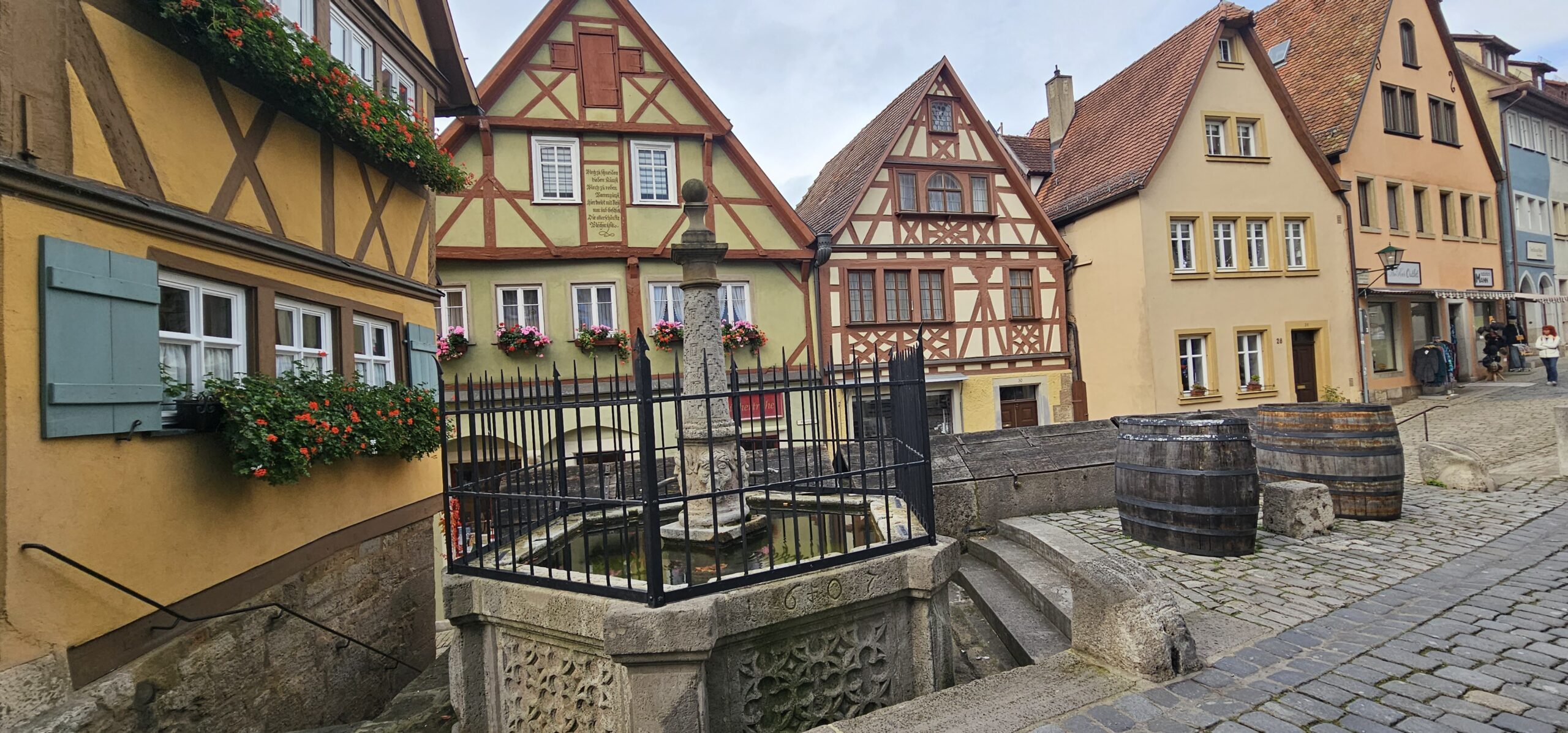 Rothenburg ob der Tauber means: Rothenburg on the Tauber (River). We arrive at Rothenburg and enter through one of the old main gates to reach the interior of the town. We had researched this and found it is rated a top-notch destination, and we find it doesn’t disappoint. This town is renowned for its well-preserved medieval architecture and the town’s layout and buildings have remained largely unchanged since the Middle Ages. This includes its intact city walls and towers where you can walk the parameter and enjoy panoramic views of the surrounding country. Rothenburg is one of only four towns in Germany that still have completely intact city walls.
