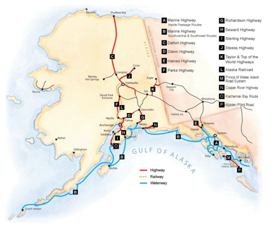 We intend to travel on all of the major paved and gravel highways that you can find in the various guidebooks on Alaska. In particular, the book called “The Milepost” (updated every year) provided us with a great deal of what to expect for road conditions and services. After some thought, we worked out a travel plan to fulfill this objective within the 3 months we are in Alaska. This section covers the stop by stop plan we have put into place and includes our booking in the fall back to Bellingham Washington on the Alaska Ferry,